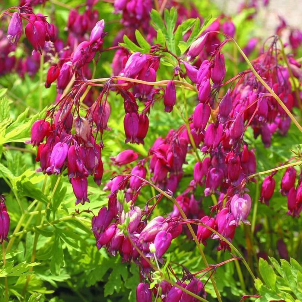 Дицентра красивая Бэкхенел (Dicentra Bekkanal) — это изящное растение для озеленения и украшения клумб, живых бордюров и изгородей. Оно особенно ценится за неприхотливость к условиям содержания. Кусты быстро растут и обильно цветут на открытом солнце или в тени, спокойно переносят недостаточно плодородные почвы. Они достигают не более 30 см в высоту, при этом хорошо разрастаются и образуют сплошное покрытие. Дицентра красивая Бэкхенел отличается оригинальной формой цветков. Они ниспадают к земле, немного сплющены по бокам и напоминают сердце. Лепестки этого сорта окрашены в ярко-малиновый цвет, а цветение Дицентры красивой Бэкхенел длится весь теплый сезон.