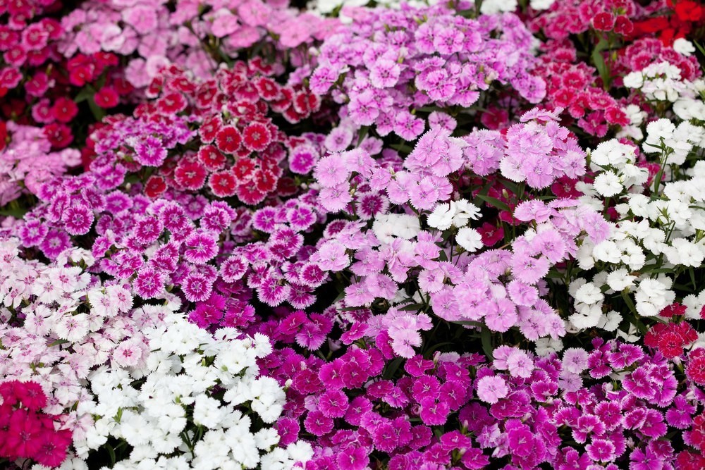 Гвоздика травянка Конфетти - вариация с цветами разных окрасок, общее для которых - ярко-розовая сердцевина, отделенная более темно-розовой каймой. Края лепестков могут быть белыми, красными и розовыми в зависимости от сорта.