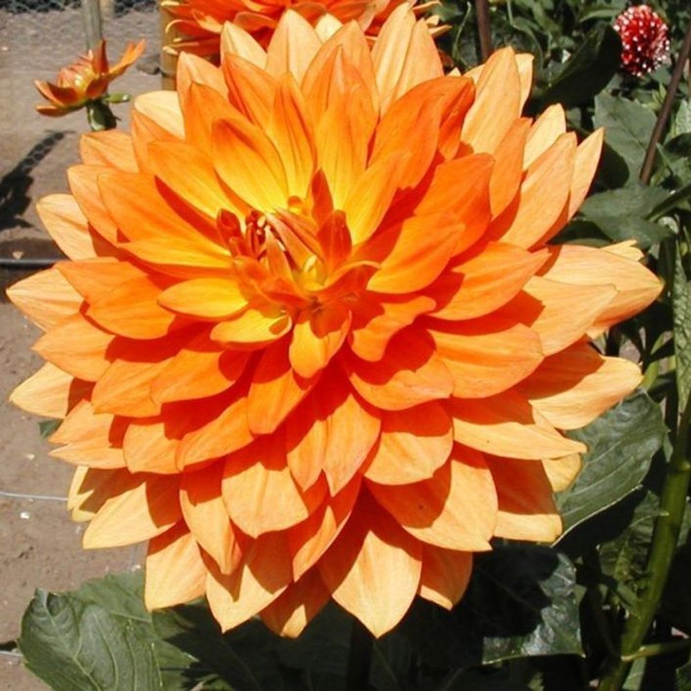 Георгина декоративная Мотто (Dahlia cultorum) — это один из самых крупных и ярких представителей вида. Растение однолетнее, но за 1 сезон успевает вырасти до 1,5—2 м в высоту. На них образуются необычные яркие цветы, каждый до 25 см в диаметре. Лепестки окрашены в оранжевый цвет, сердцевина желтая. Такие соцветия эффектно смотрятся в больших букетах — их можно использовать в том числе для создания композиций в полный рост.