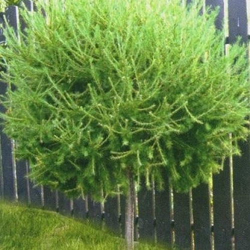 Хвойный кустарник с шаровидной кроной и ярко-зеленой хвоей. Выращивается в штамбовой форме. Высота взрослого растения обычно не превышает 2 м. Ветви короткие, густые, растут вверх. В зимний период не теряет декоративности. Мягкие иголки средней длины (3 см) появляются ранней весной, осенью желтеют и опадают.