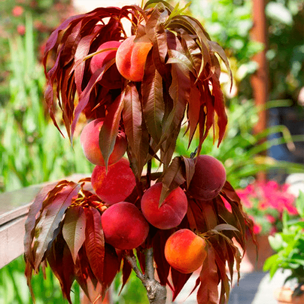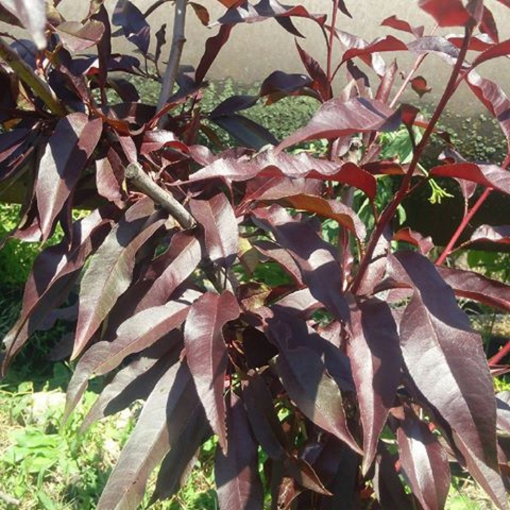 Персик Бургунди - декоративно-плодовый сорт персика среднепозднего срока созревания, высотой до 2 метров. У него стройная и густая крона, а его листва имеет необычный оттенок. Листья имеют форму ланцета и окрашены в красно-фиолетовый цвет, который к осени постепенно меняется на зеленый с красными прожилками. В мае начинают распускаться нежно-розовые цветы на этом дереве.