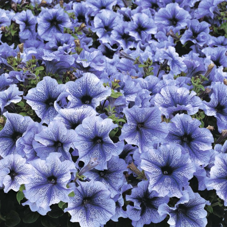 Петуния Plum Crystals — гибрид с меняющейся окраской цветков от ярко-сиреневой до бледной. Лепестки покрывает сеть выделяющихся фиолетовых жилок. Куст высотой 30 см, диаметр цветков 7 см.
