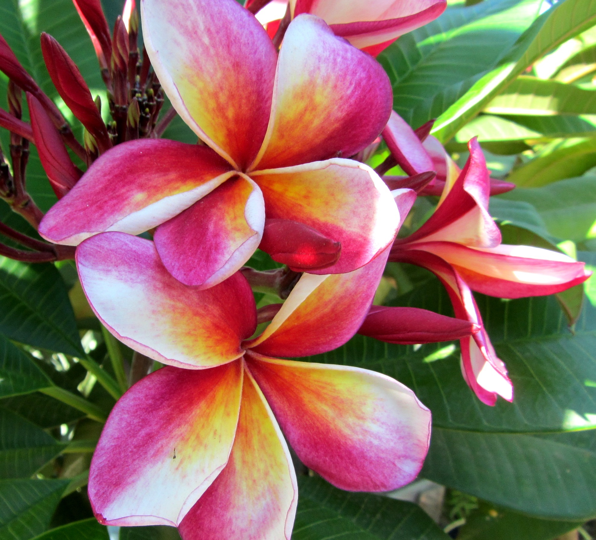 Plumeria Peach Pink Slash Thai - прекрасное растение. Листья темно-зеленые, крупные, со светлыми тоненькими жилками. Цветки большие, 5-лепестковые. Лепестки продолговатой формы, закругленные, невероятной окраски, которая включает в себя белый, розовый, желтый, оранжевый и красный оттенки.