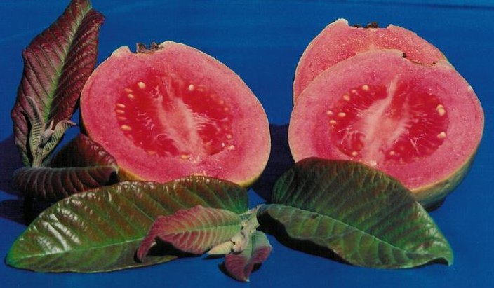 Psidium guajava Red Indian - плодовое экзотическое деревце. Плоды округлой формы, средних размеров, ароматные. Кожица желтая, часто с розовым румянцем. Мякоть средней плотности, красная, сладкая, высококачественная. Содержание аскорбиновой кислоты - 195 мг на 100 г свежих фруктов. Семена многочисленные, маленькие. Плоды идеально подходят для свежего потребления.