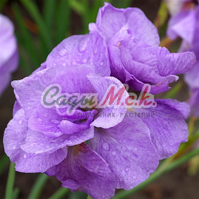 Рассада ириса Acoma относится к высоким бородатым ирисам, известным как пликата, т.е. в которых яркий рисунок располагается на более светлом фоне. Это однократно цветущий ирис, на каждом стебле которого развивается от 5 до 6 бутонов. Нижние доли (фолы) имеют светлый фон цвета слоновой кости и фиолетовые края, мягко переходящие друг в друга. Верхние доли (стандарты) – светло-светло-голубые, вертикально подняты вверх. Бородка – желтая, малозаметная. Верхние и нижние доли слегка гофрированные. Цветение среднее.