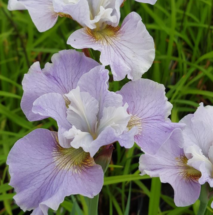 Нежнейшие розовато-сиреневые волнистые лепестки: бледно-сиреневые стандарты и сияющие белые лопасти столбиков над чуть более темными фолами с бледно-желто-зеленым горлом. Лиловые жилки подчеркивают хрупкость и изящество "танцующего" цветка. Цветет в мае - июне, поднимая взвихренные юбочки цветов на высоту 60-75см