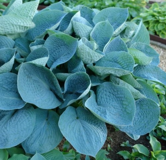 Хоста Love Pat. Листья у этого сорта очень крупные, широкие, практически круглые, ребристые, насыщенного сине-голубого цвета, сильно жатые, текстурированные, чашевидной формы. Куст растёт в виде большой эффектной куртины, густой, мощный, высотой до 50-70см. Цветет в июле обильно и продолжительно, крупными, почти белыми цветами без аромата.