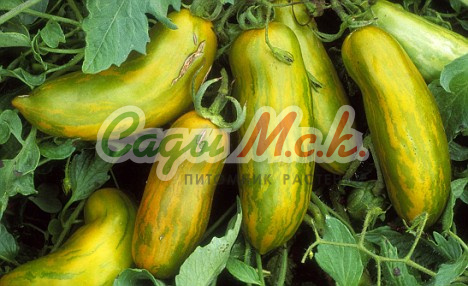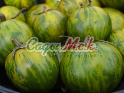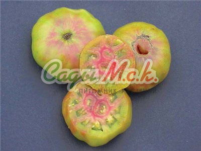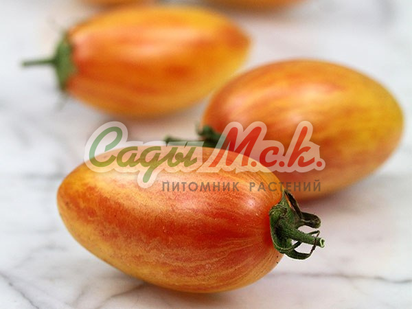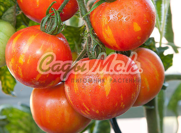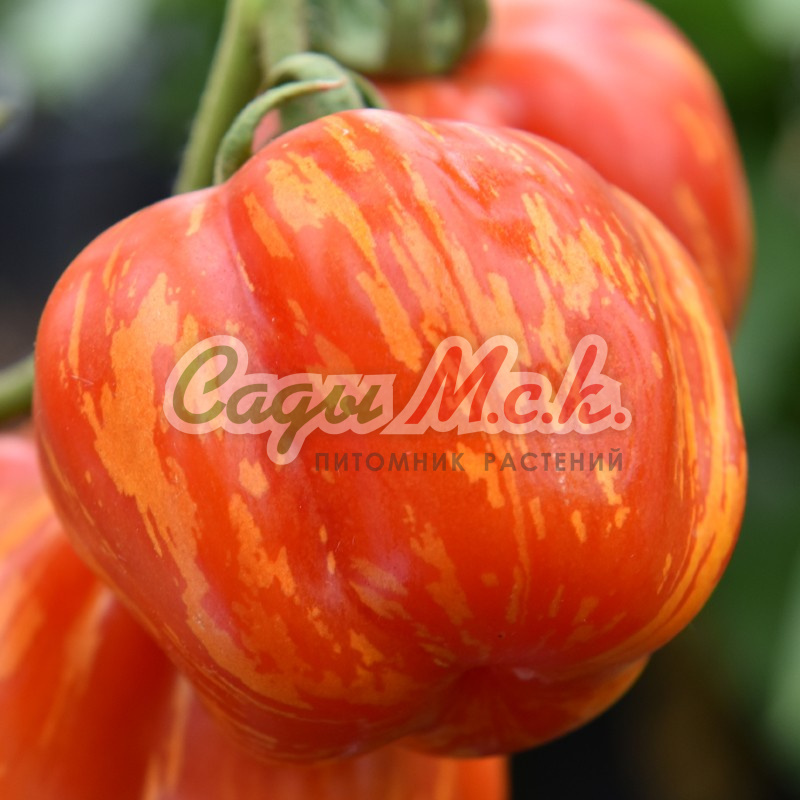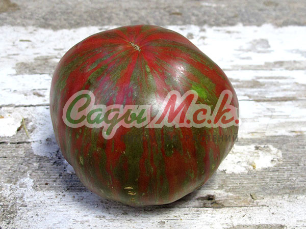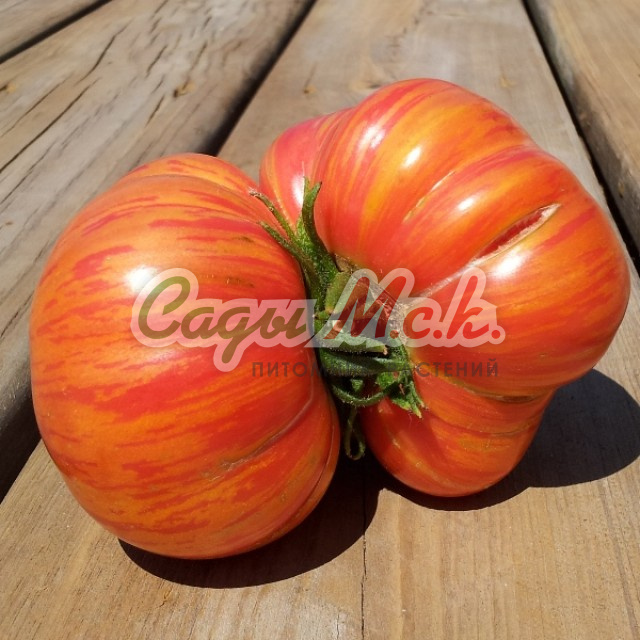 Новый биколорный сорт, относится к типу биф-томатов, среднеспелый (110-115 дней от всходов до плодоношения), индетерминантный для выращивания в теплицах. Плоды необычной окраски, крупные (200-350г) плоскоокруглой формы, очень сочные, мясистые, сладкие на вкус, без кислинки с приятным цитрусовым послевкусием. Мякоть в разрезе оранжевая, с розовой серединкой. Спелые томаты желто-оранжевого цвета с красными полосками и фиолетовым напылением на плечике, причем чем больше солнца, тем больше красных полосок и интенсивнее фиолетовое напыление. Великолепно подходят для ароматных летних салатов и ярких овощных нарезок. Посев на рассаду проводят в начале марта. Пикировка — в фазе первого настоящего листа. Высадку рассады в теплицы — в мае по схеме 40х60 см. Через несколько дней после высадки растения формируют в один стебель, удаляя все «пасынки» и нижние листья, и подвязывают к опоре. В конце вегетации прищипывают точку роста. Плодоношение длительное даже при неблагоприятных погодных условиях. Семена после уборки сохраняют всхожесть в течение 10 лет при оптимальных условиях хранения. Рекомендуется увеличить норму высева по окончании срока годности.