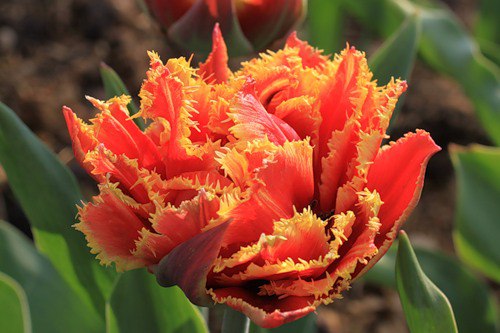 Тюльпан Gold Dust - тюльпан махровый и одновременно бахромчатый, каждый лепесток покрыт игольчатой бахромой. Цветок лососево-алый с желтой бахромой сверкает, словно яркий фейерверк! Основание лепестков желтое. Цветки большие, размером до 15-18 см. Форма цветка пионовидная. Высота бокала около 5 см. Срок цветения средний. Высота растения - 45 см. Прочный цветонос позволяет выдерживать сильные весенние дожди. Сорт хорошо подходит для мартовской выгонки. Очень эффектно смотрится в горшках. Средней силы роста. Используется для озеленения, клумбовой посадки, весенней выгонки и для срезки.