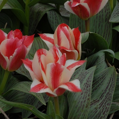 Тюльпан Greig s Happy - очень нежный красивый цветок. Форма цветка бокаловидная. В одном цветке насчитывается 6-12 лепестков. Окрас лепестков красный с чисто-белой каймой. Стебли невысокие, средней длиной 15 см, зеленые с бордовым оттенком. Листья зеленые, с темно-бордовыми штрихами.