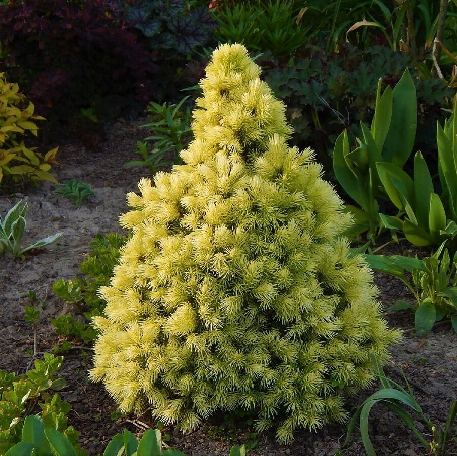 Взрослое растение (около 10 лет) обычно не превышает 0,8 м в высоту, поэтому его используют в альпинариях, небольших садах. Крона плотная, конусообразная. Крупномер сизая Daisy’s White декоративен весной, когда ветви покрываются бело-желтыми приростами, напоминающими новогодние игрушки. Побеги удлиняются и летом, но украшены они темно-зеленой мягкой хвоей. Сорт морозостойкий, любит полутень, потому что на солнце может получить ожоги. Саженцы приживаются на дренированных почвах.